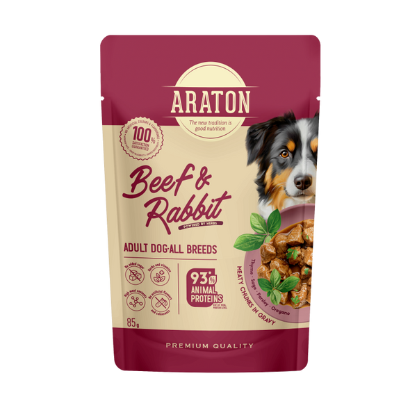 ARATON täissööt veise- ja küülikuliha kastmes ühendab loomuliku maitse ja tõelise väärtuse teie koera tervisele. See toit on välja töötatud täiskasvanud koertele kõikidest tõugudest igapäevaseks toiduks ilma liigsete lisaaineteta, kuid kasuliku koostisega.