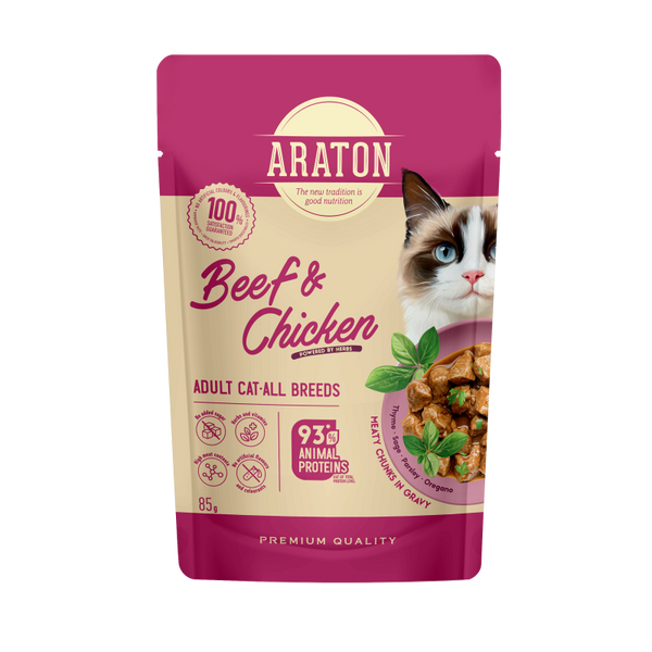 ARATON täissööta märgtoit veise- ja kanalihaga on mõeldud täiskasvanud kassidele kõikidest tõugudest, pakkudes igapäevast toitumist ilma liigsete lisaaineteta, kuid kasuliku sisaldusega.