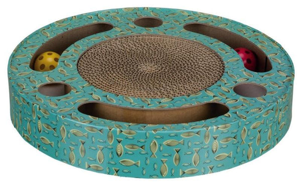 Ümmargune kartongist kraapimispuu kassile.