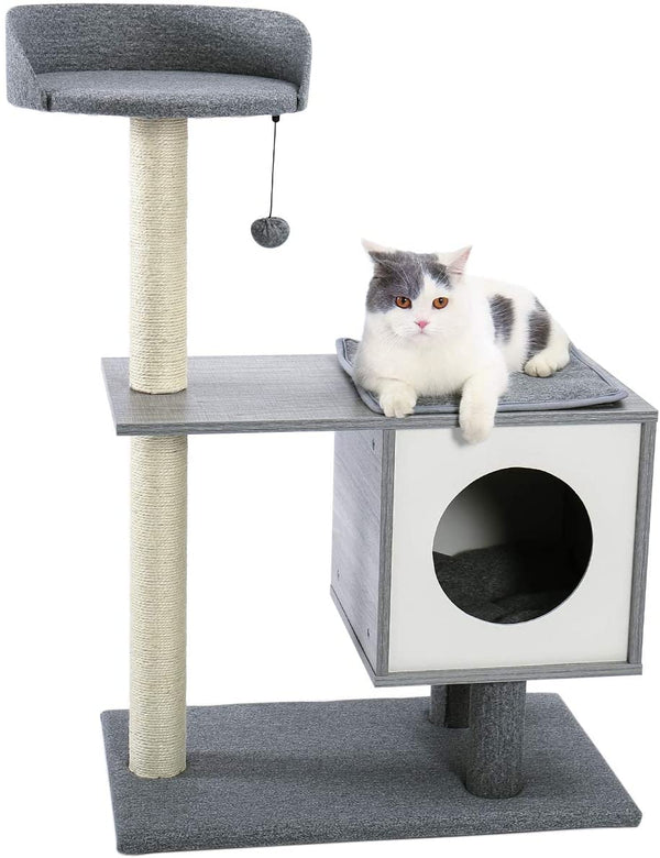 Multifunktsionaalne kraapimispuu kassidele. Seinad sobivad rebimiseks, selle külge kinnitatud pall on mängudeks ning erinevatel kõrgustel poodiumid ja auk on kinnitatud lõõgastumiseks ja magamiseks.