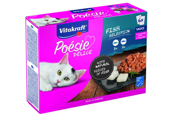 Vitakraft poesie delice multipack on täisväärtuslik atlandi tursa ja saidaga söödakomplekt täiskasvanud kassidele.