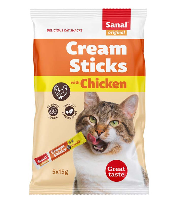 SANAL Cream sticks with Chickennärimismaiused kassidele – spetsiaalselt kassidele loodud vedel maius kanalihaga. Suurepärane valik, kui soovid oma lemmiklooma hellitada toitumiskordade vahel, kuna tegemist on tervisliku ja madala kalorsusega suupistega.