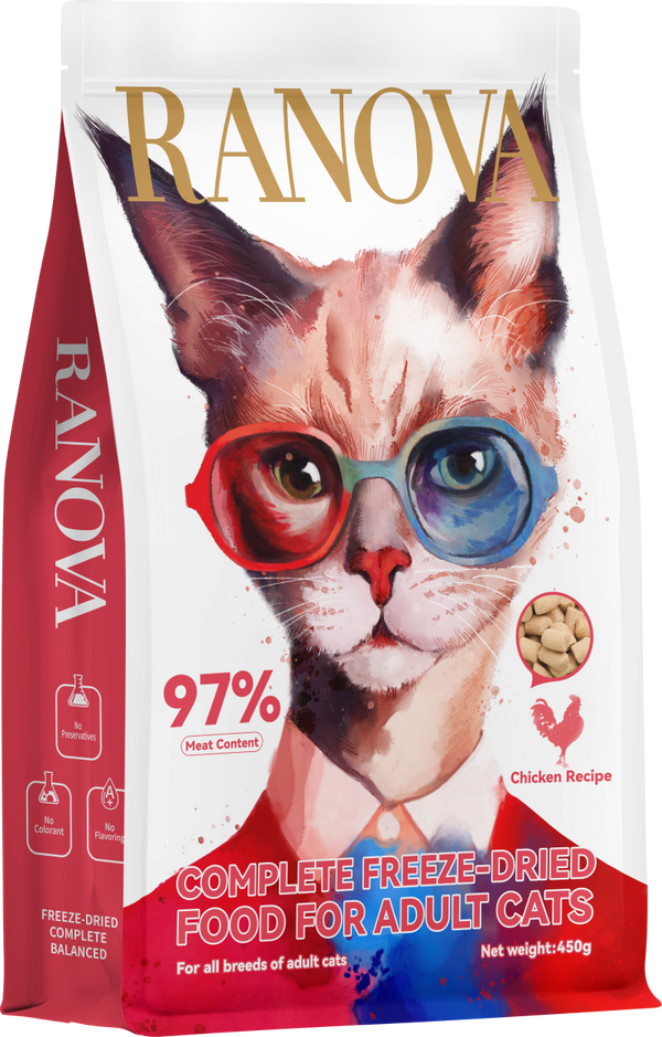 RANOVA on täisväärtuslik ja tasakaalustatud toit täiskasvanud kassidele: värsked koostisosad, mis rahuldavad kassi lihavajadust, külmutatud madalal temperatuuril, et säilitada algne maitse.