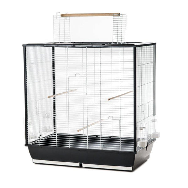 Keskmise suurusega metallist-plastikust puur papagoidele koos lisadega.
