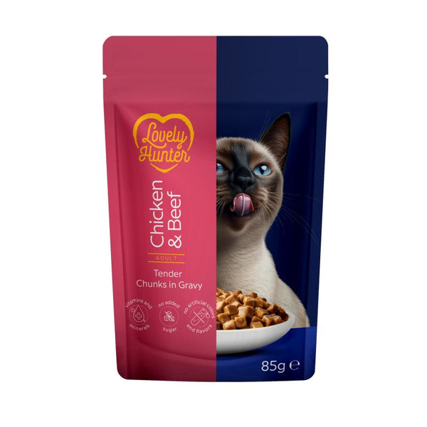 Lovely Hunter märgtoit kana ja veiselihaga on igapäevane lahendus täiskasvanud kassidele, ühendades maitsva toidu, olulised valgud ja tähtsad toitained.