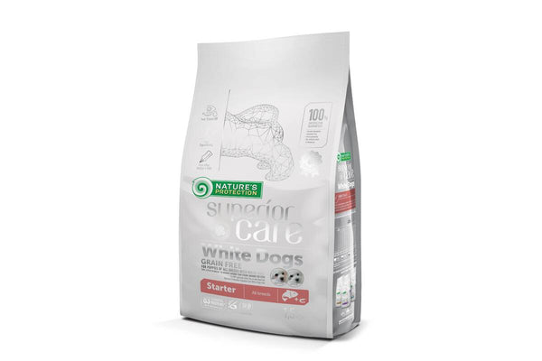 Nature's Protection Superior Care White Dogs Grain Free Starter All Breeds on kvaliteetne kuivtoit, mis sobib kuni 4-kuusetele kutsikatele ja tiinetele ning imetavatele koertele. Sobib väga hästi heleda ja valge karvaga kutsikatele. Aitab ära hoida karva värvumist pruuniks silmade all, suu ümbruses ja käppadel.