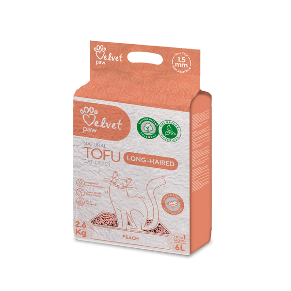 VELVET PAW TOFU pikakarvaliste kasside kassiliiv virsikuessentsiga on toodetud 100% looduslikust hernekiust, ei sisalda sünteetilisi lisandeid ega värvaineid.