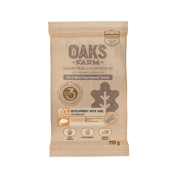 OAK’S FARM Development with Care lõhega ei ole lihtsalt maius, vaid teadlikult loodud toidulisand kuni 12-kuuste kutsikate kasvuks, pakkudes igapäevaselt tuge luidele, tervetele liigestele ja immuunsusele.