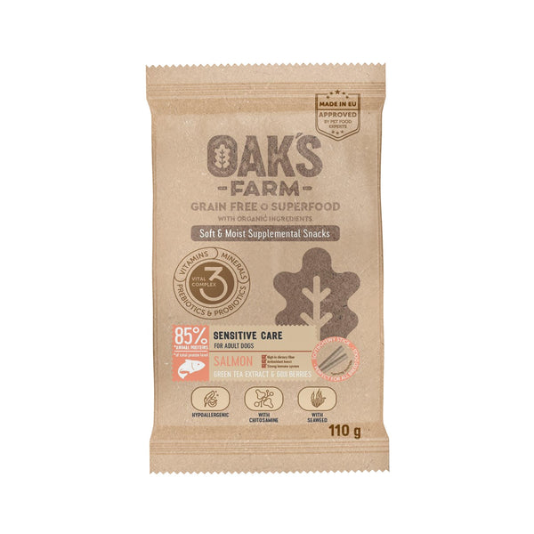 OAK’S FARM Sensitive Care lõhega ei ole lihtsalt maius, vaid hoolikalt koostatud valik tundliku seedimise või allergiakaldustega koertele, aidates igapäevaselt hoida teie lemmiku tervist.