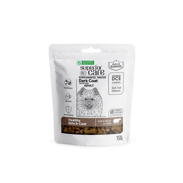 Nature's Protection Superior Care Dark Coat Grain-Free Healthy Skin & Coat – väga kvaliteetne toidulisand, maius tumeda karvkattega igat tõugu täiskasvanud koertele. Rikastatud lambalihaga, tagab läikiva ja terve karvkatte ning säilitab optimaalse naha tervise, tagades seeläbi üldise lemmiklooma heaolu.