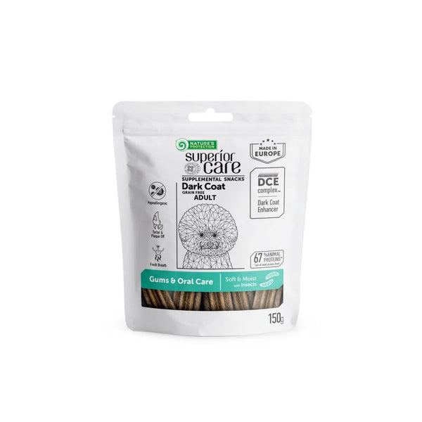 Nature's Protection Superior Care Dark Coat Grain-Free Gums & Oral Care – väga kvaliteetne toidulisand-maius tumeda karvkattega igat tõugu täiskasvanud koertele. Putukavalguga rikastatud unikaalne maius aitab toetada suuõõne tervist, vähendab hambakatu ja hambakivi teket ja tagab värske hingeõhu.