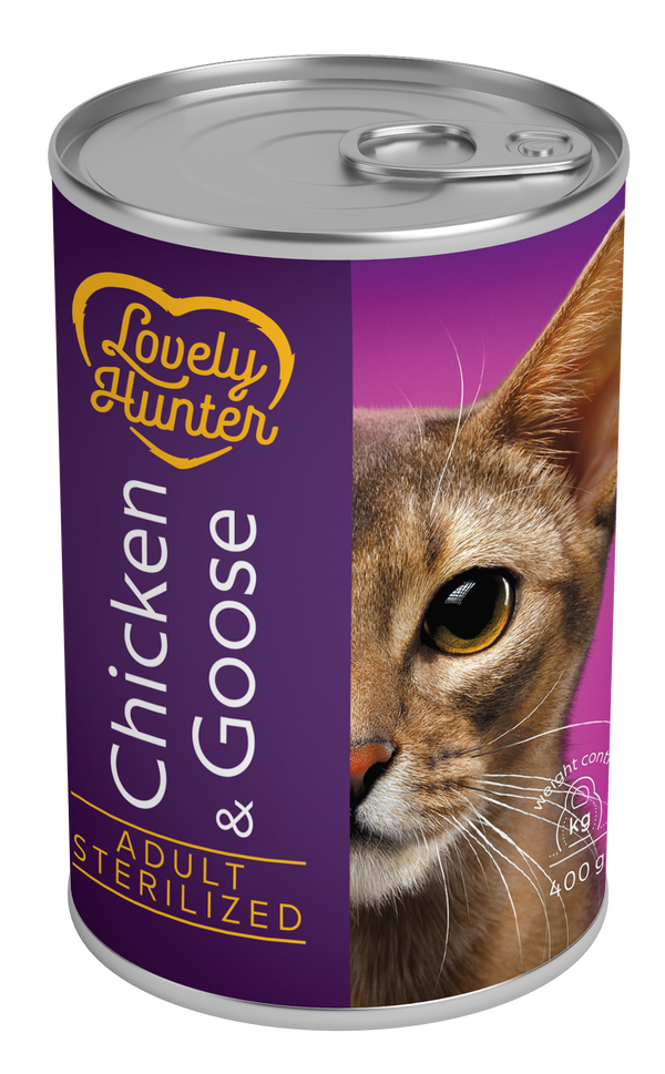 LOVELY HUNTER Adult Steriliseeritud Chicken & Goose on konservtoit kana- ja hanelihaga täiskasvanud steriliseeritud kassidele.