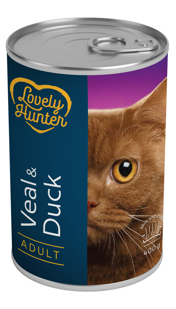LOVELY HUNTER Adult Veal & Duck on täisväärtuslik konserveeritud toit vasikaliha ja pardilihaga täiskasvanud kassidele.