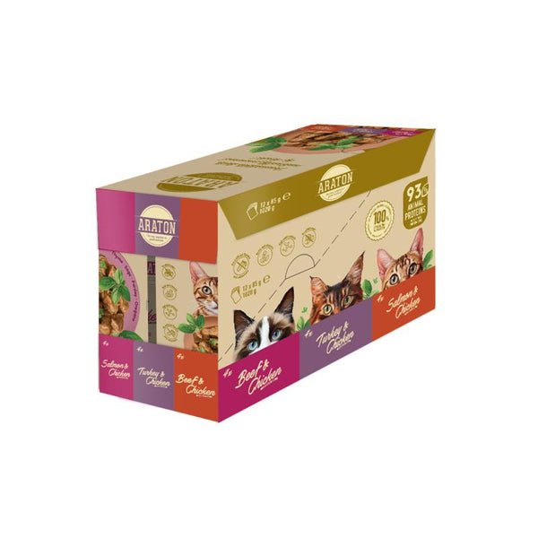 ARATON täistoit niiskes vormis kalkuni ja kana, veise ja kana ning lõhe ja kana koostises on kolm erinevat retsepti, loodud igapäevaseks toitmiseks, kui nii maitse mitmekesisus kui ka tasakaalustatud toitumine on olulised. Kassid on valivad loomad, kelle vajadused muutuvad vanuse, hooaja või meeleolu järgi.