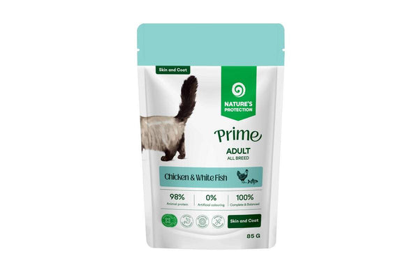 Natures Protection Prime märgtoit kassidele kanaga ja valge kalaga on igapäevane toit täiskasvanud kassidele, kui oluline on nii suurepärane maitse kui ka täisväärtuslik toitumine. Selle tasakaalustatud koostis, pehme tekstuur ja kergesti seeditavad toitained aitavad hoida energiat, heaolu ja tervet keha.