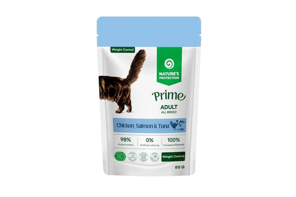 Natures Protection Prime märgtoit kassidele kanaga, lõhe ja tuunikalaga on täisväärtuslik ja tasakaalustatud igapäevane toit kõikide tõugude täiskasvanud kassidele, loodud ideaalse kehakaalu hoidmiseks. Kergesti seeditavad valgud, pehme tekstuur ja looduslik niiskus aitavad hoida energiat ja heaolu iga päev.